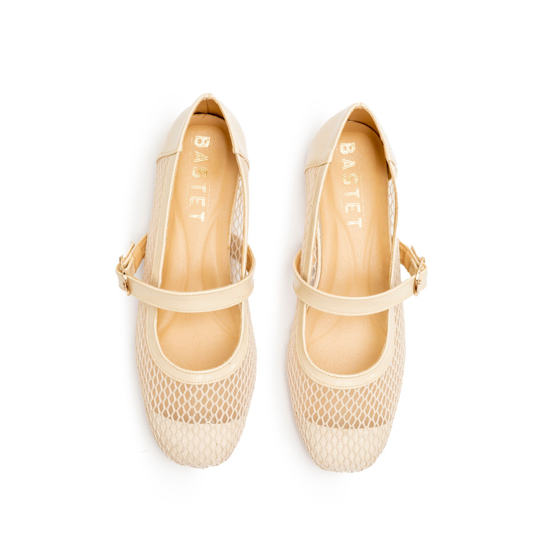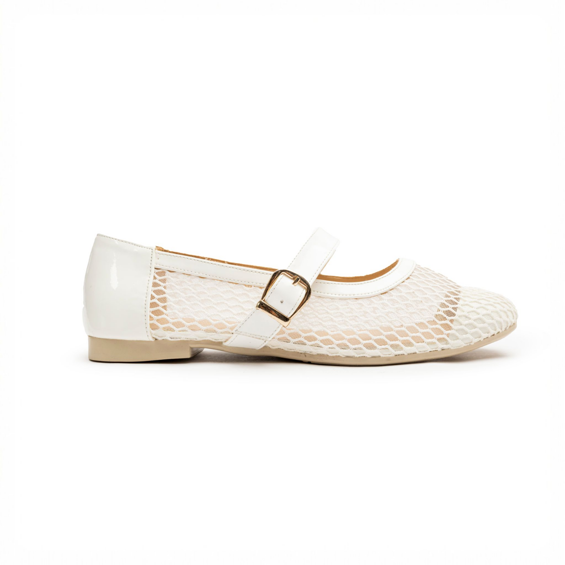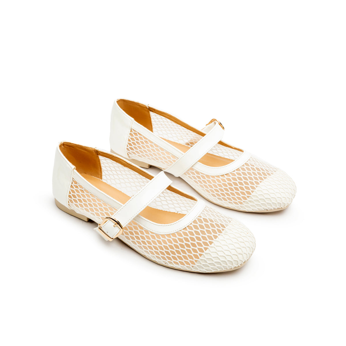 Elegant Mary Jane flats crafted from premium Falea mesh with PU trim, designed for breathability and comfort with a modern chic style.