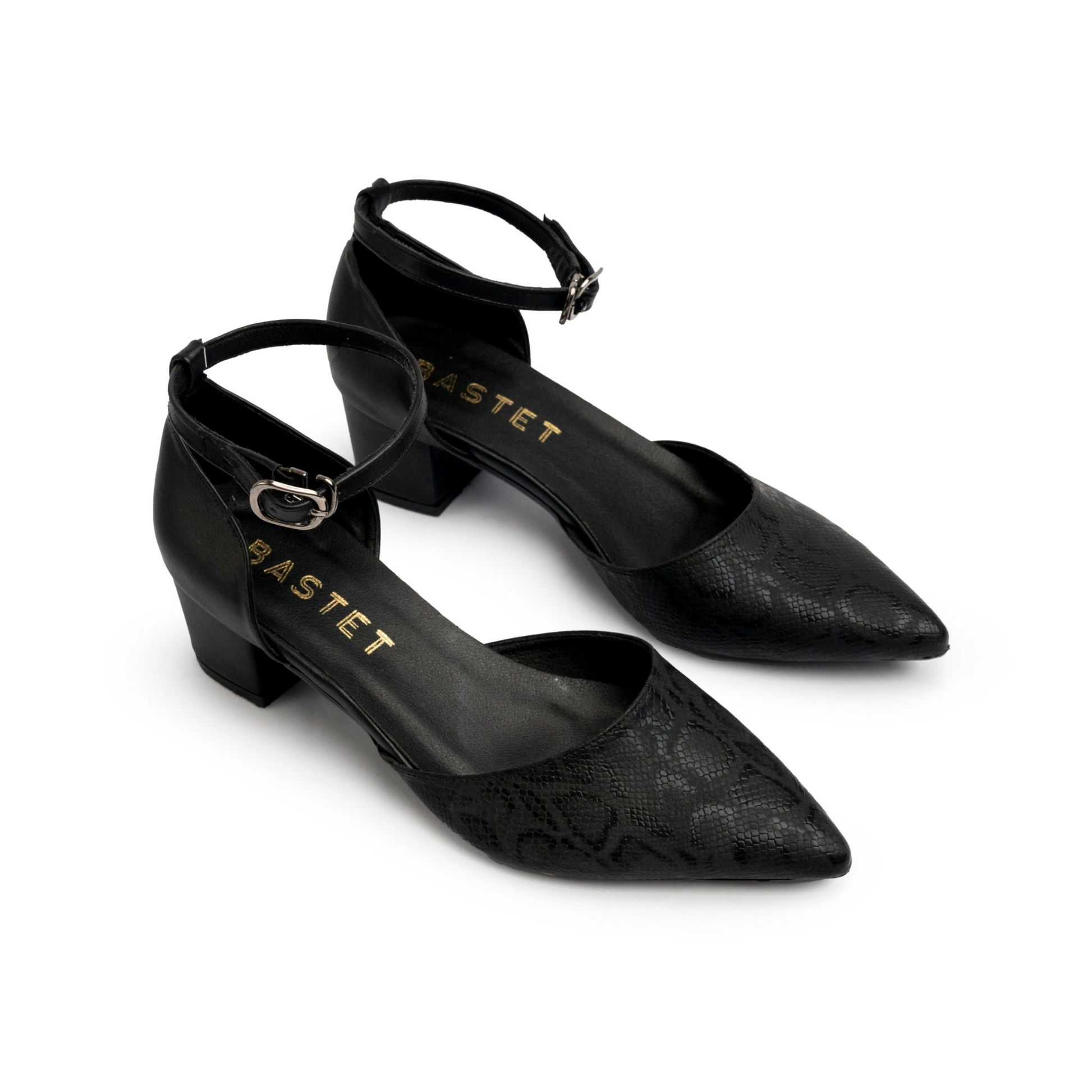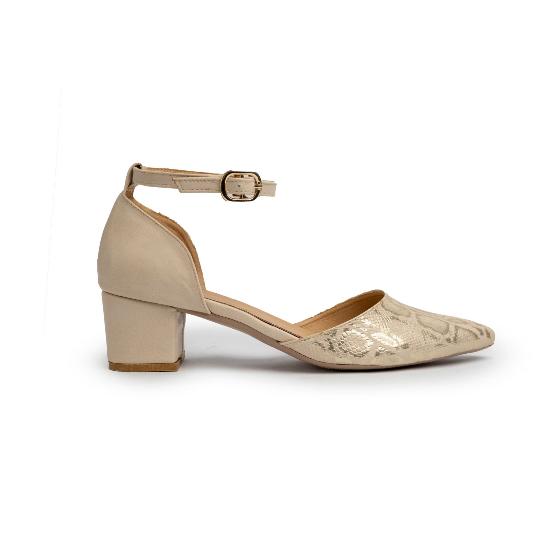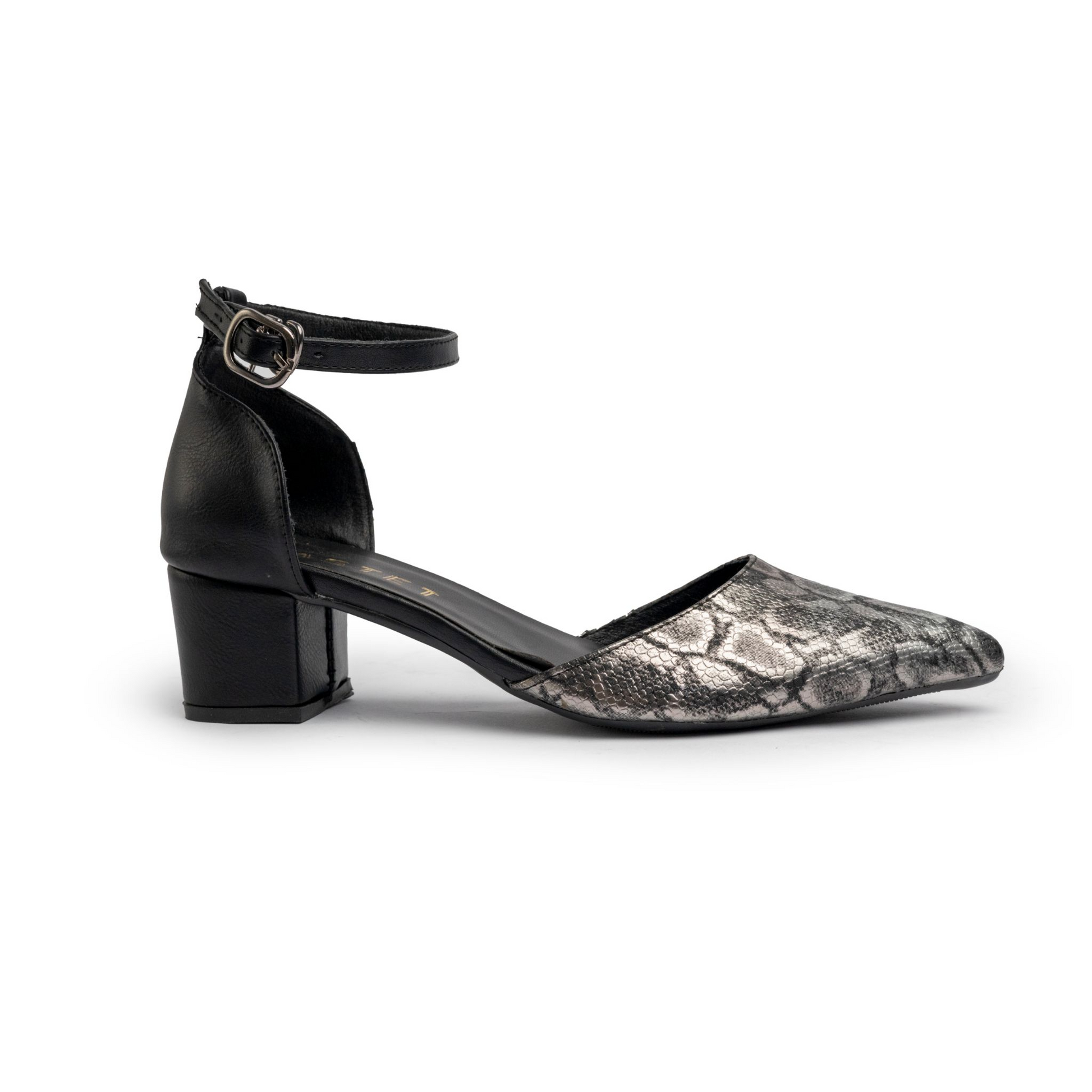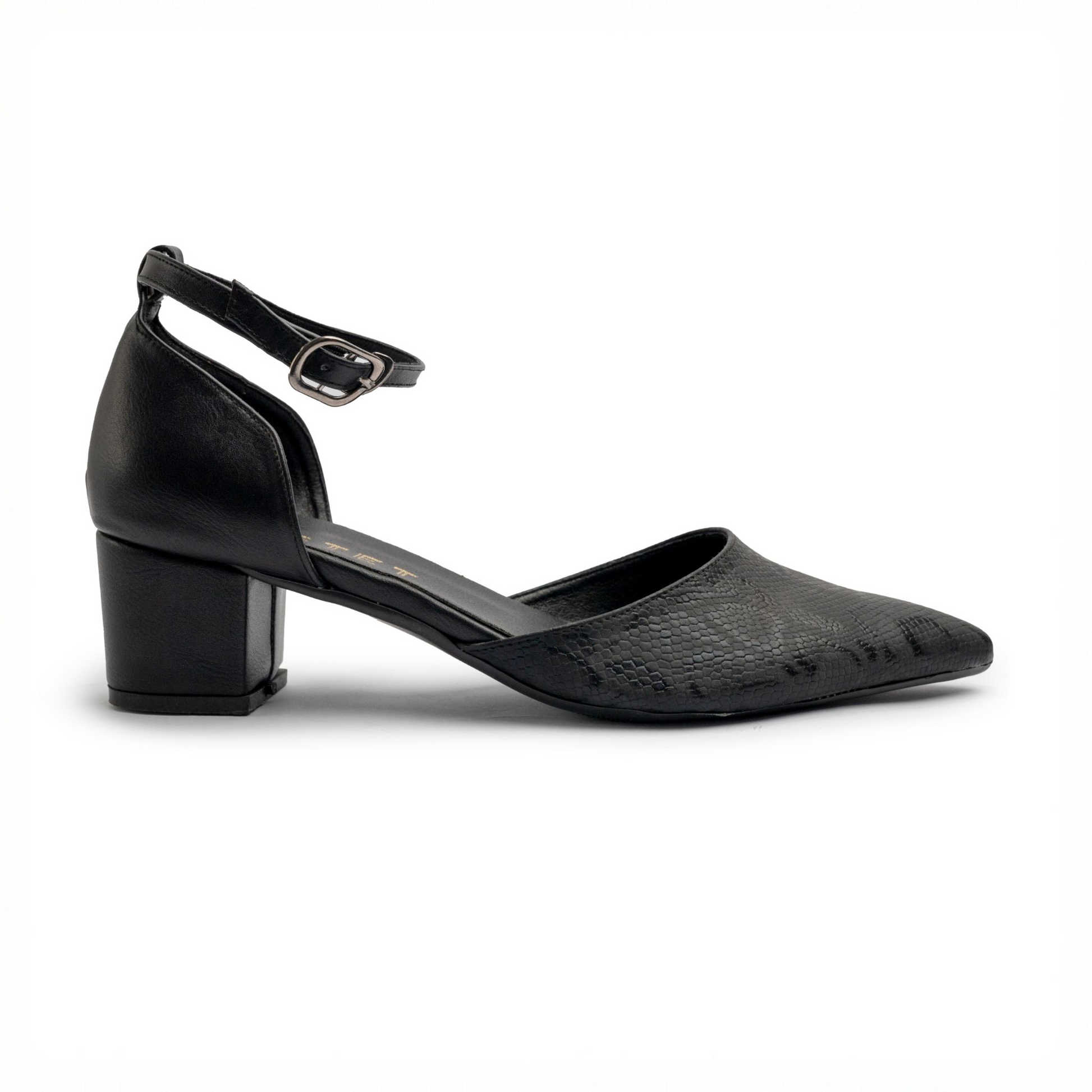 Modern low-heel pumps featuring an elegant shiny snakeskin texture and adjustable ankle strap for a refined, secure fit. Perfect for everyday elegance and comfort.