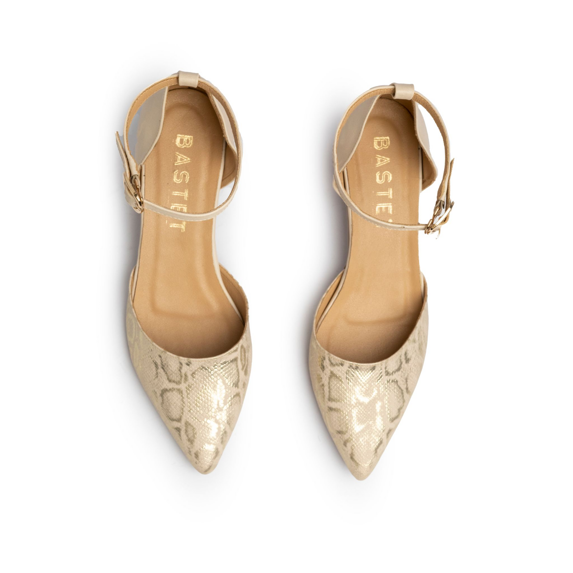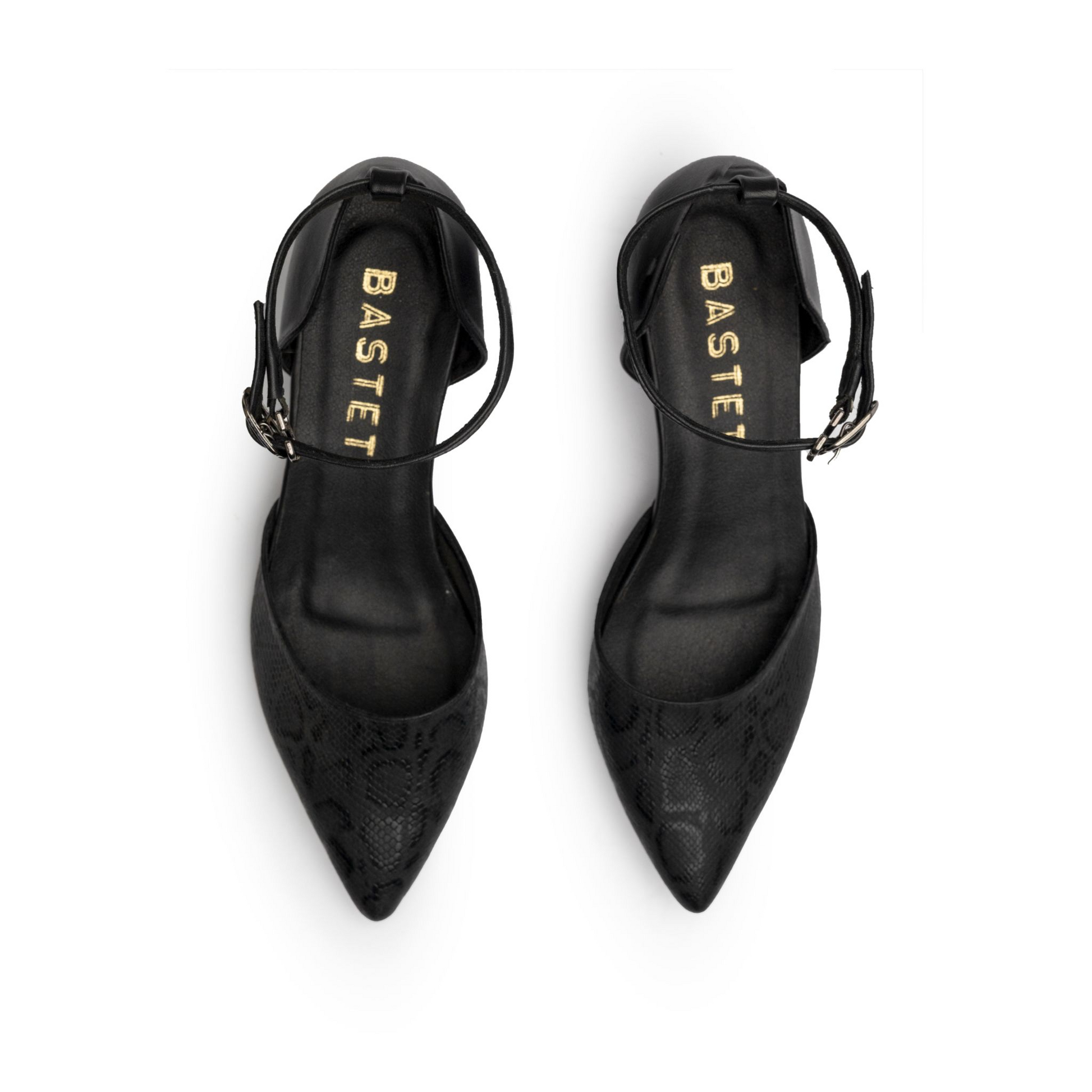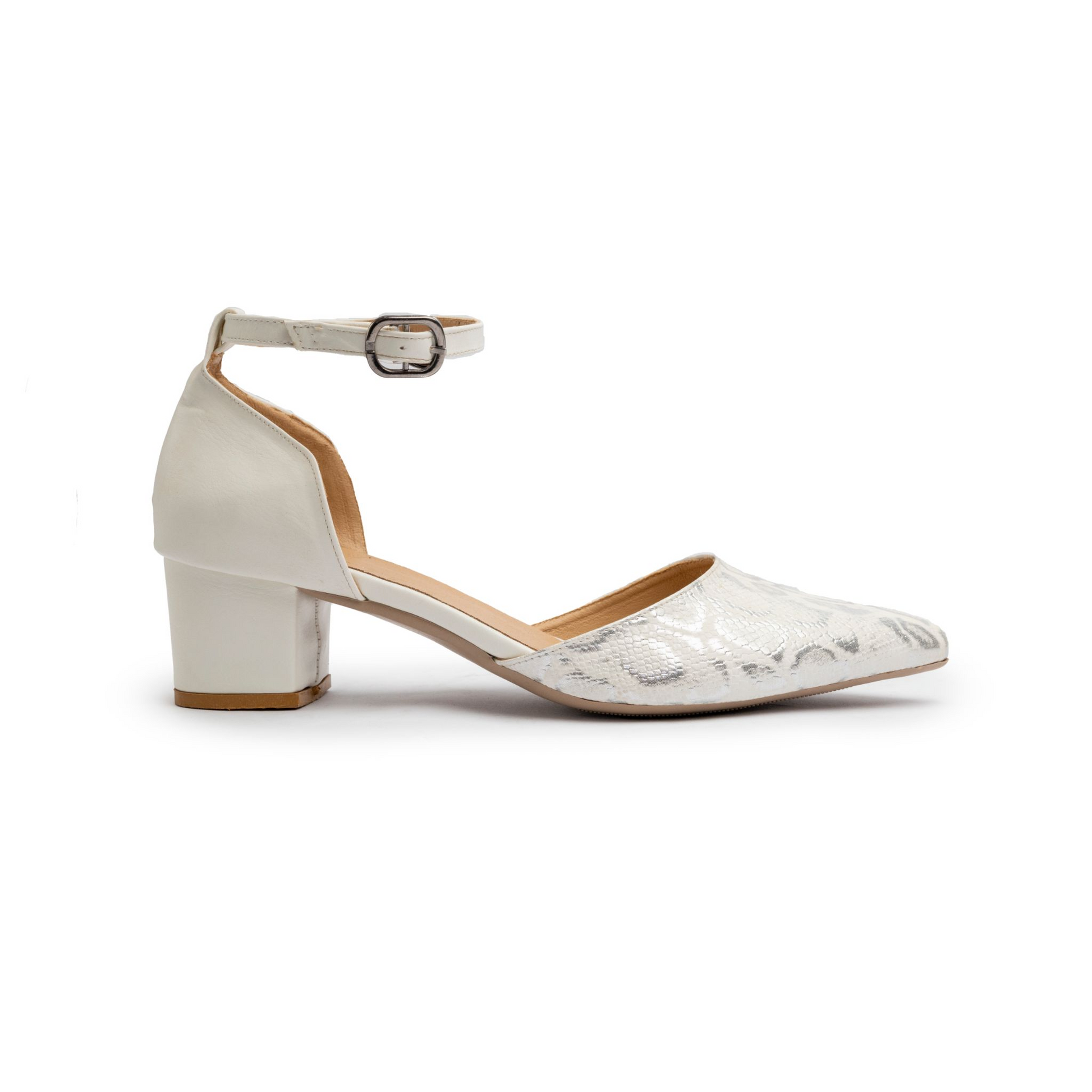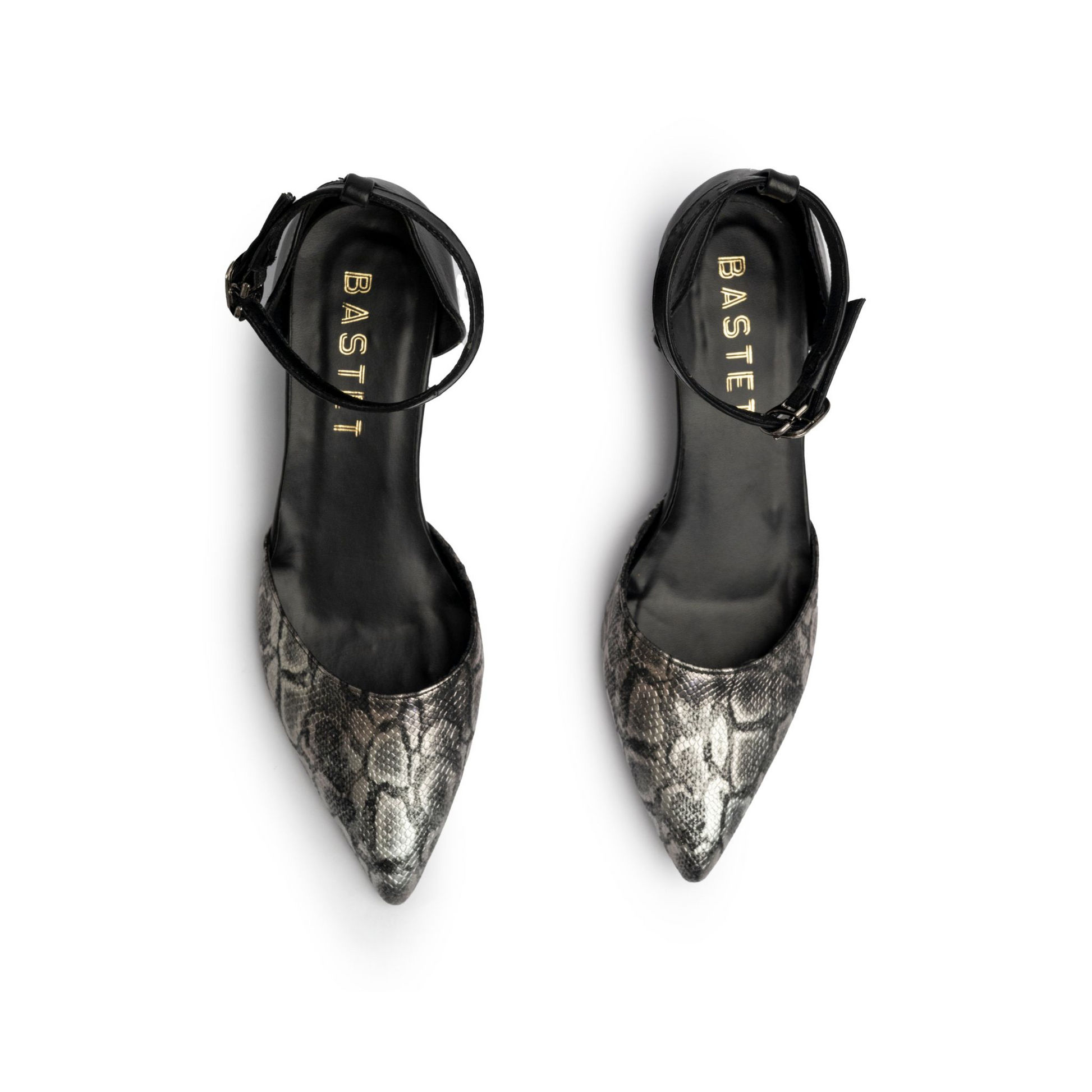 Modern low-heel pumps featuring an elegant shiny snakeskin texture and adjustable ankle strap for a refined, secure fit. Perfect for everyday elegance and comfort.