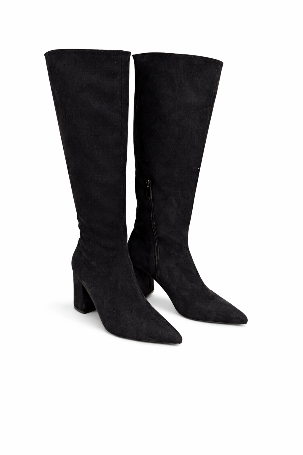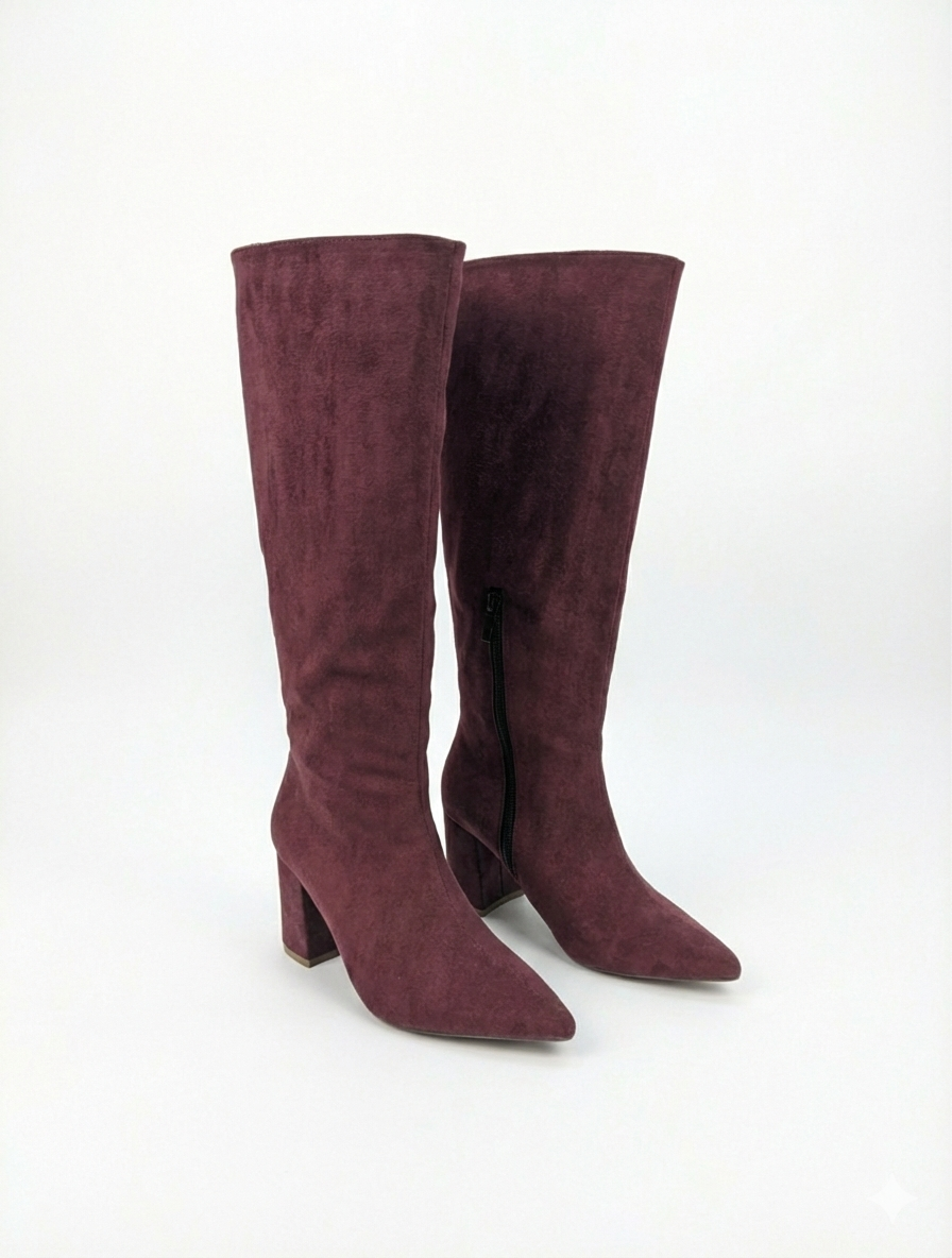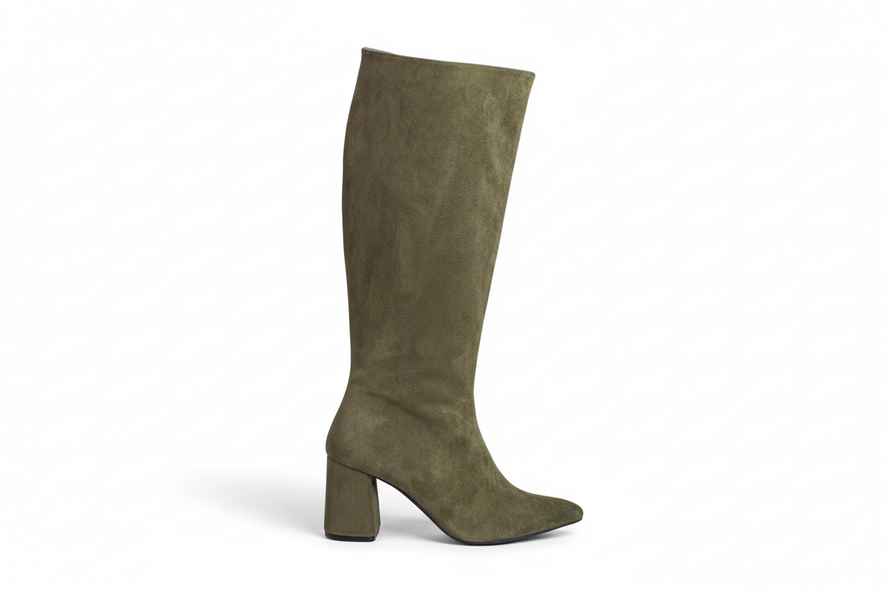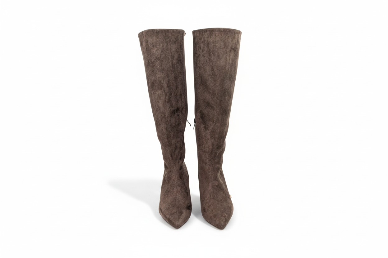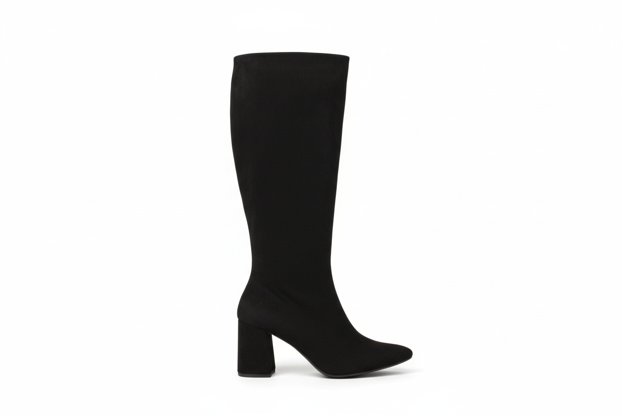 A sleek knee-high boot with a clean, structured shaft and a balanced block heel that offers both elegance and stability. The smooth silhouette and pointed toe create a timeless design that transitions effortlessly from everyday wear to refined evening looks.